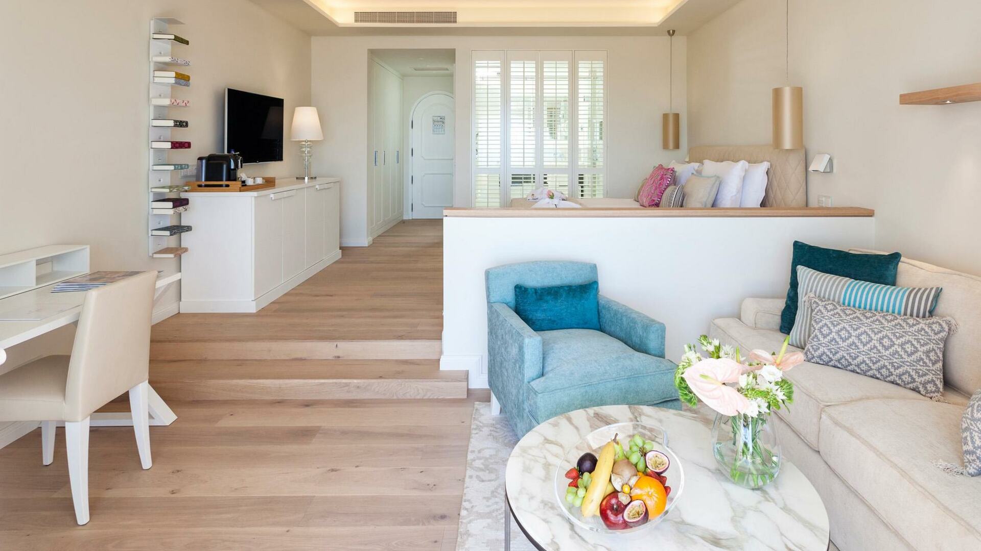 With a spacious lounge and dining area, Grand Suites have contemporary lines with a minimalist palette of seaside-inspired injections of colour, and light that pours directly in.