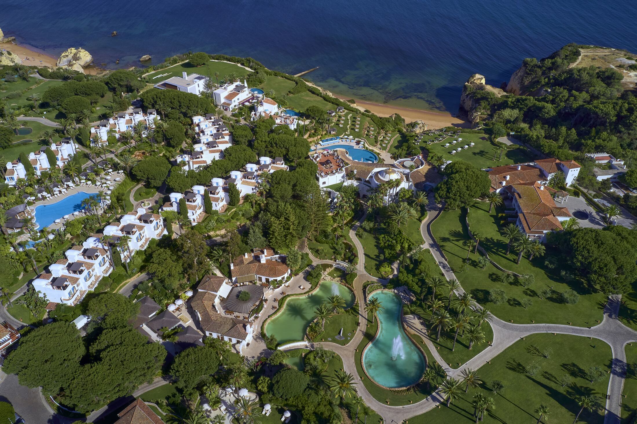 The hotel is located in Porches, Algarve, Portugal, on a cliff with direct access to a secluded white sand beach and the Atlantic Ocean. The resort is approximately 38-40 km from Faro International Airport (FAO), about 45 minutes by car or airport transfer.