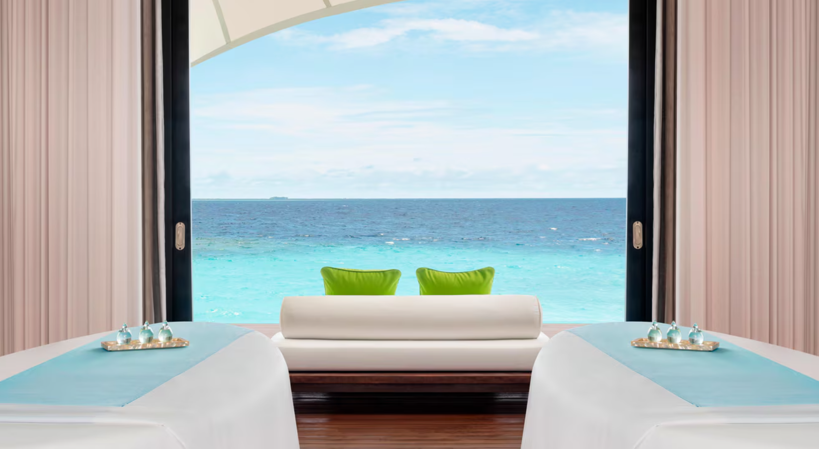 The spa is located overwater and offers a complete wellness experience with ocean views. It includes private treatment rooms, massages, facials and body treatments, restorative programs, and relaxing rituals.