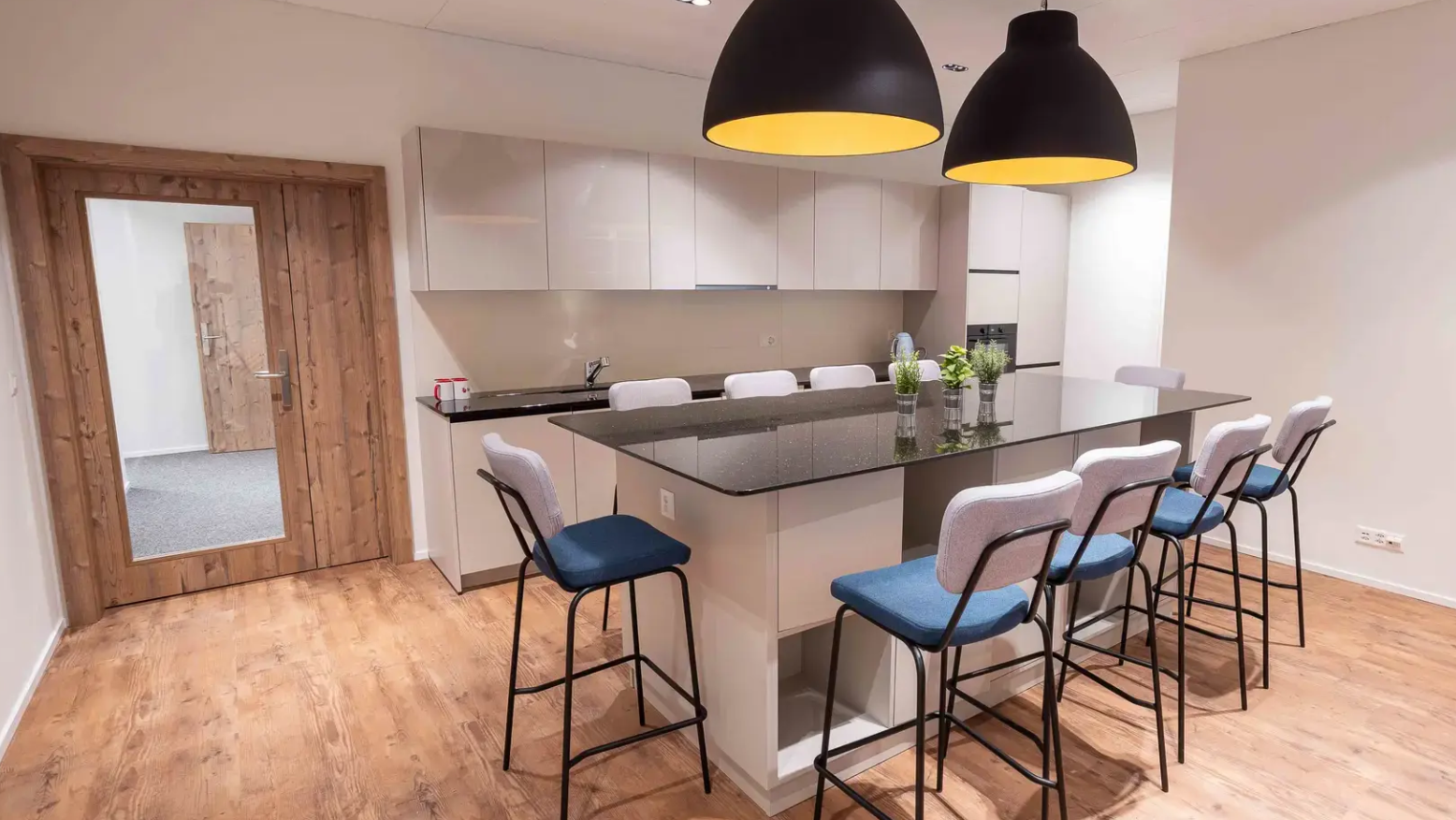 - Each room has beds, wardrobes for storing things, a work area, Wi-Fi.