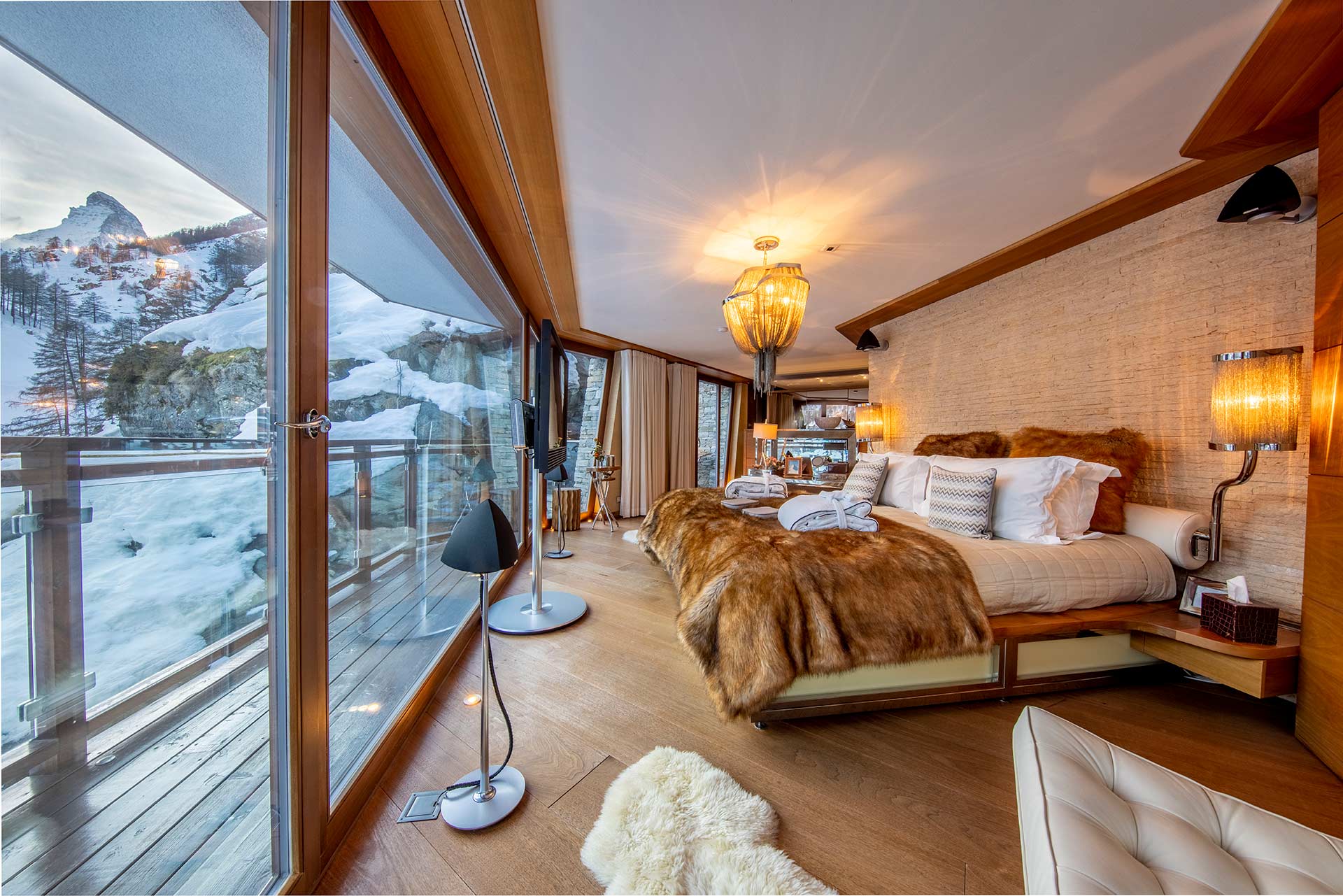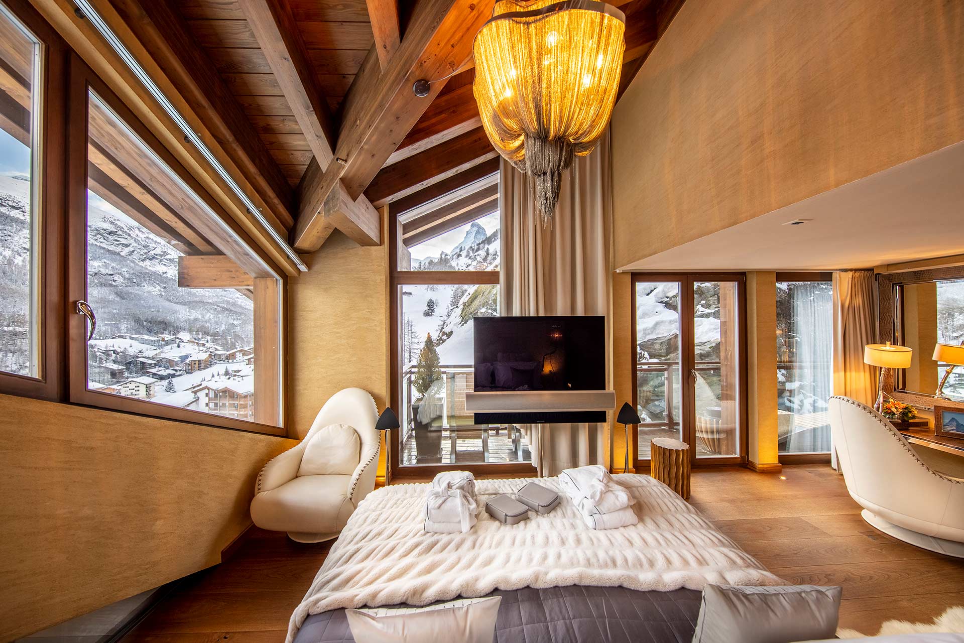 Day or night, this chalet offers stunning views of the famous Matterhorn mountain and its surrounding peaks, the charming village of Zermatt and the endless sky above.