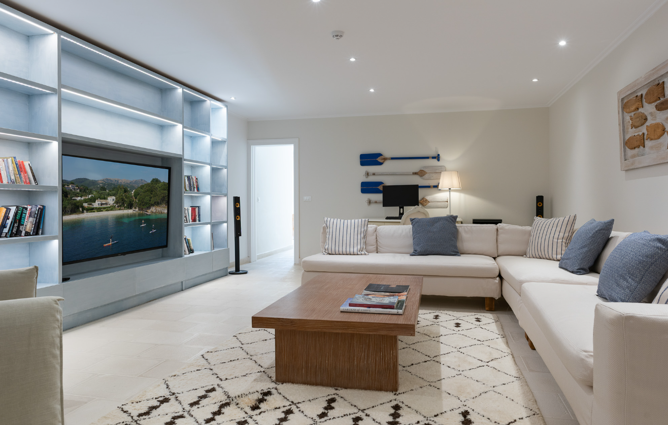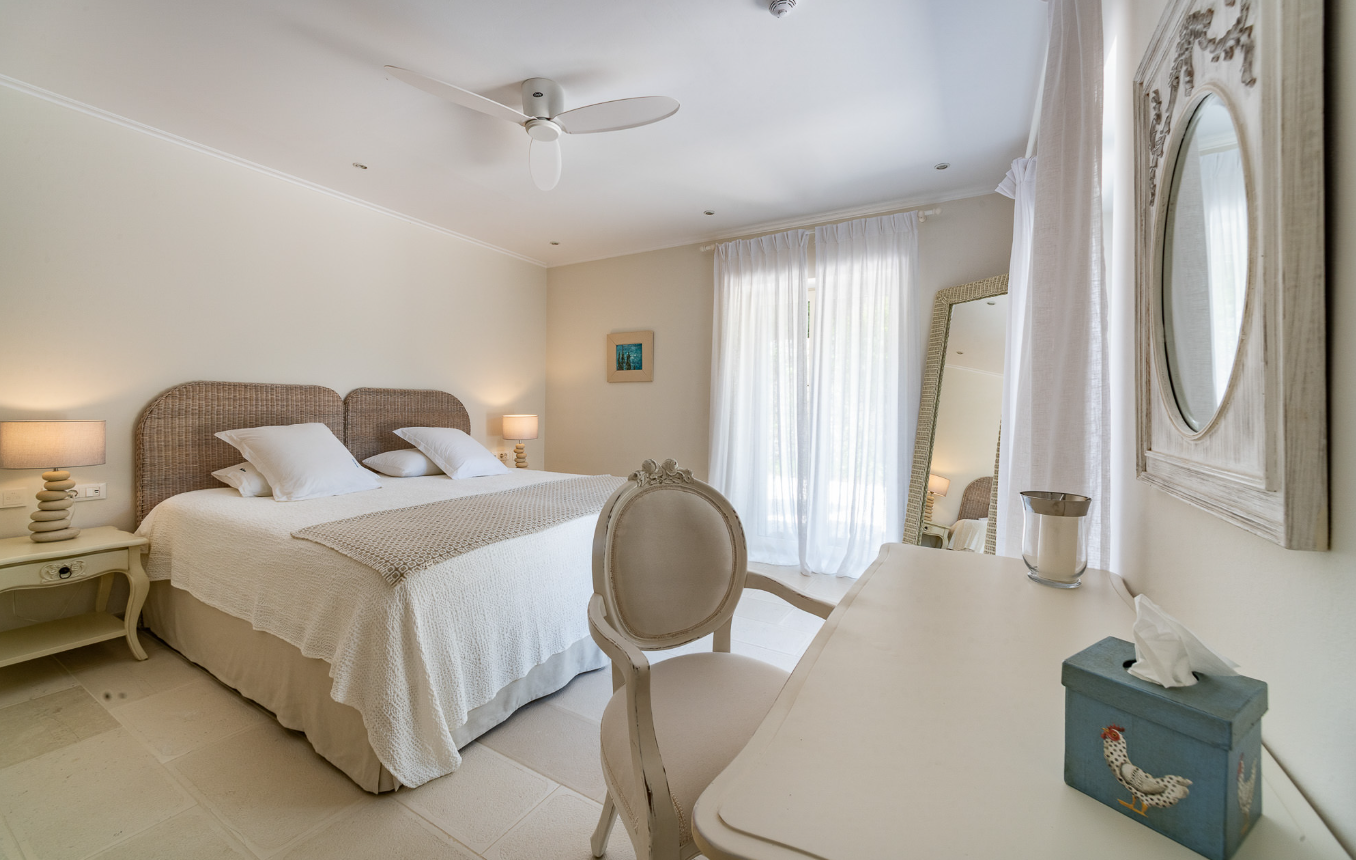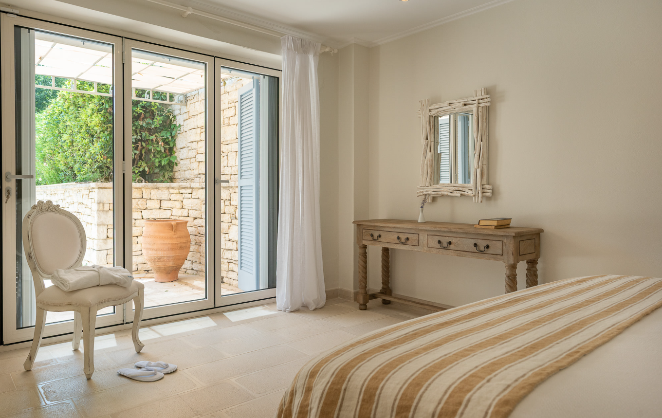 All bedrooms have air conditioning, en-suite baths or showers, private terraces or Juliet balconies, and views of either the sea or the garden and pool.