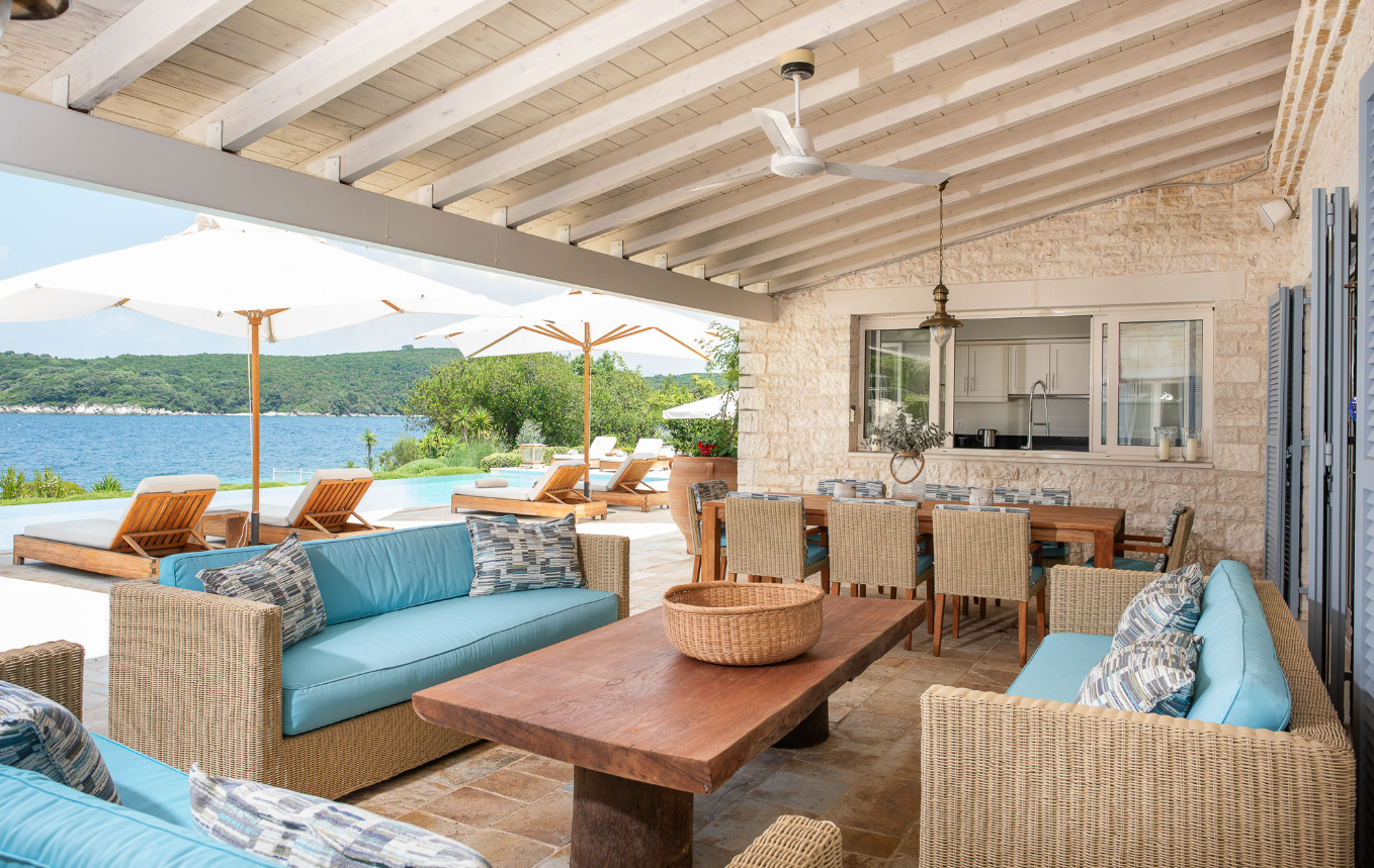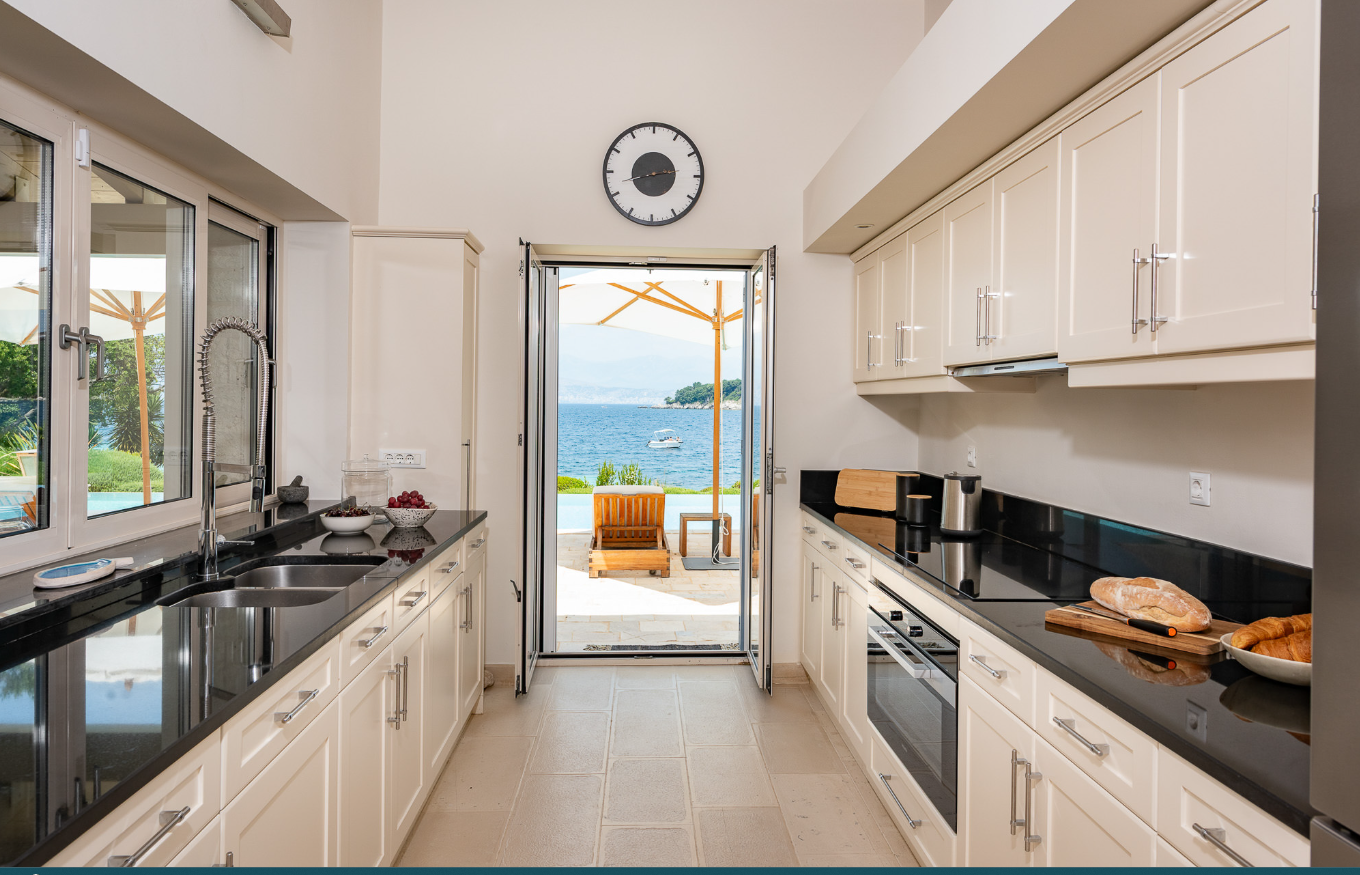 The villa is located on the beach, with a private dock and direct access to the sea. It's close to Avlaki Beach and close to waterfront tavernas. The villa is approximately 50 minutes' drive from Corfu Airport. The villages of Kassiopi and St. Stephano are just a short drive away.