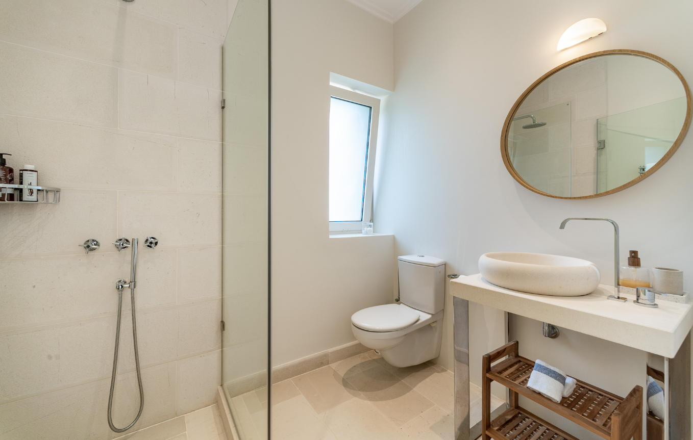 The master suite overlooks the sea and pool, and features a balcony/terrace.
