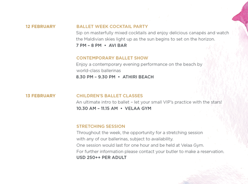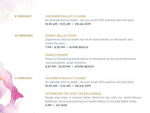 Ballet performans will take place on the Maldivian private island of Velaa Private Island from 8 to 14 February. The ballet week will include: