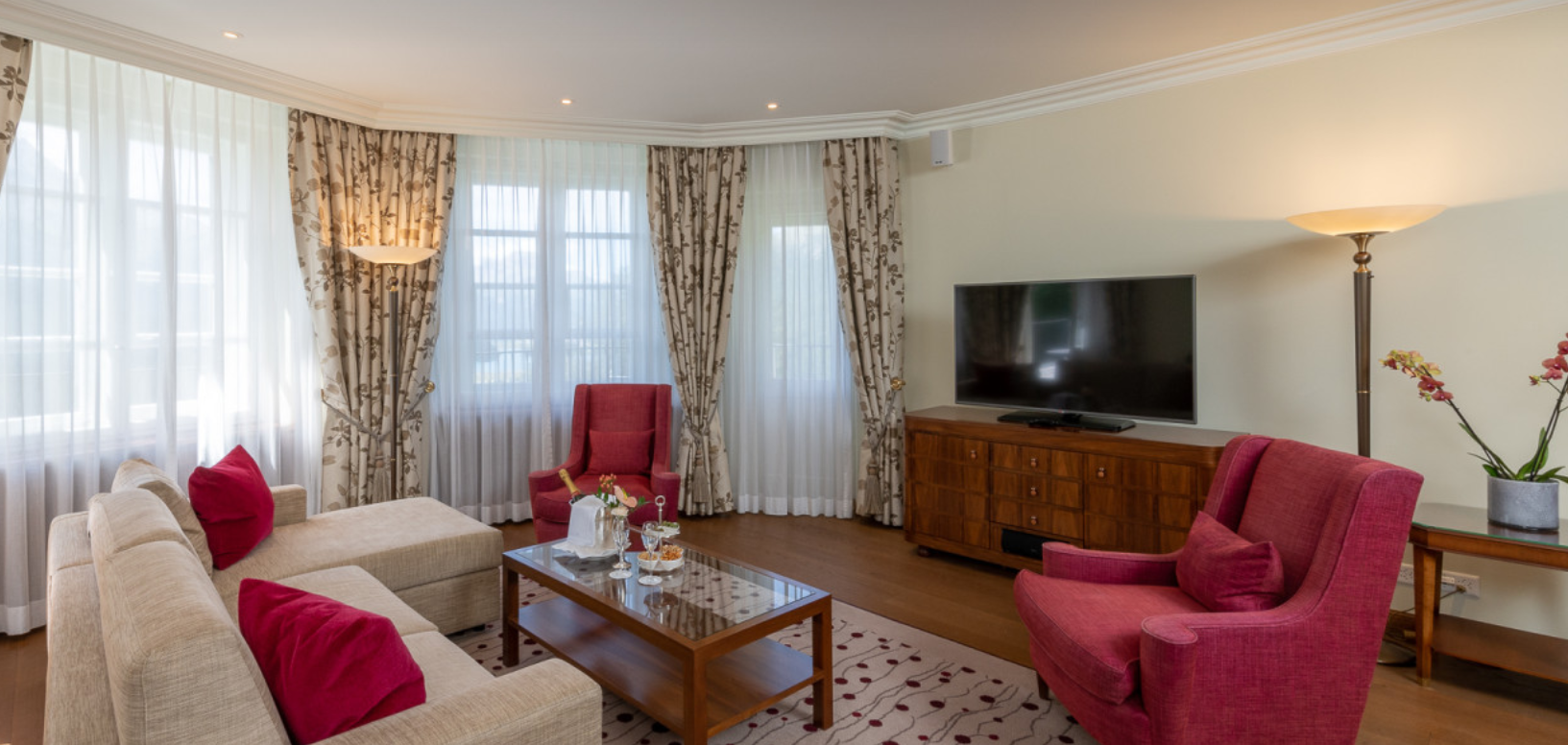 Номера люкс площадью 65 м² с захватывающим видом на юг оформлены в современном стиле и обставлены с учетом высоких стандартов. Обширный вид на горы и озера Энгадина в сочетании с комфортом ванной комнаты, душевой кабины и просторной гостиной (некоторые номера доступны по запросу) гарантируют незабываемые впечатления от вашего пребывания у нас в Санкт-Морице.