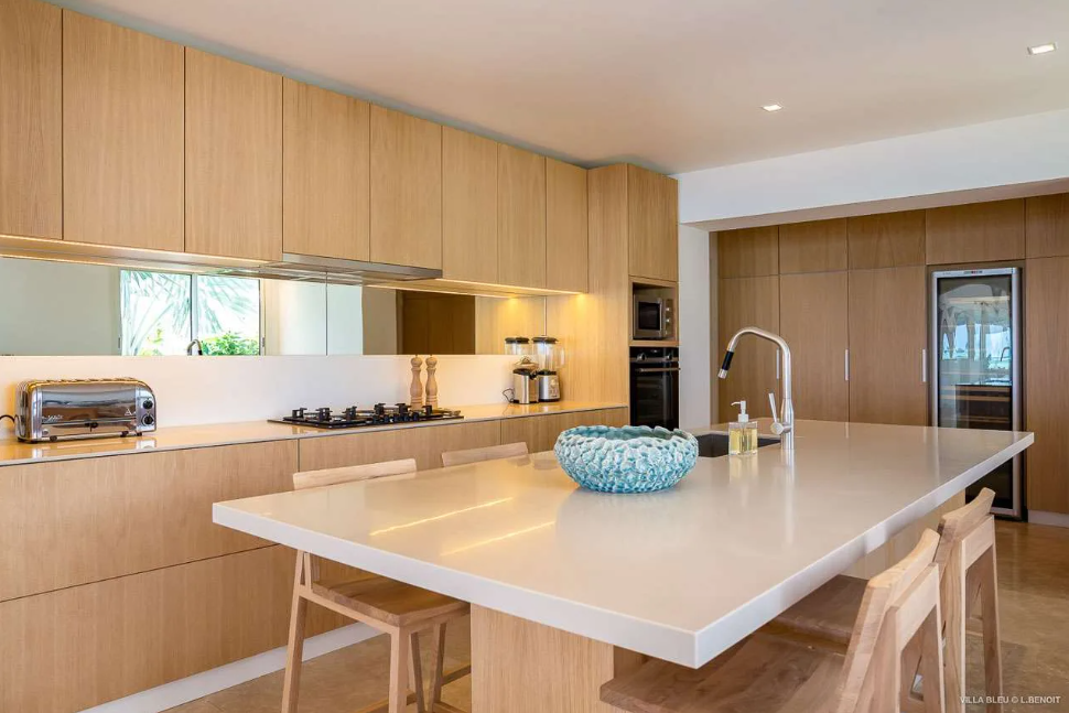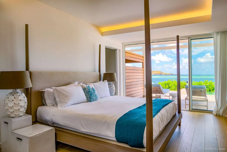 Шесть спален виллы Aqua — это роскошные сьюты, каждый с собственной ванной комнатой. Два из них — мастер-сьюты, расположенные на верхнем уровне, с королевскими кроватями, гардеробными, балконами с видом на море, душем-дождём и ванной. На основном уровне — четыре гостевые спальни; две имеют виды на океан, две — на сад. Во всех спальнях кондиционер, личные террасы, уютный стиль с использованием натурального дерева и мягких оттенков. Центр дома — большая гостиная зона с комфортными диванами, большой обеденный стол, кухня-гурме с современным оборудованием, а также вспомогательная кухня-prep-kitchen с холодильником и винным шкафом.