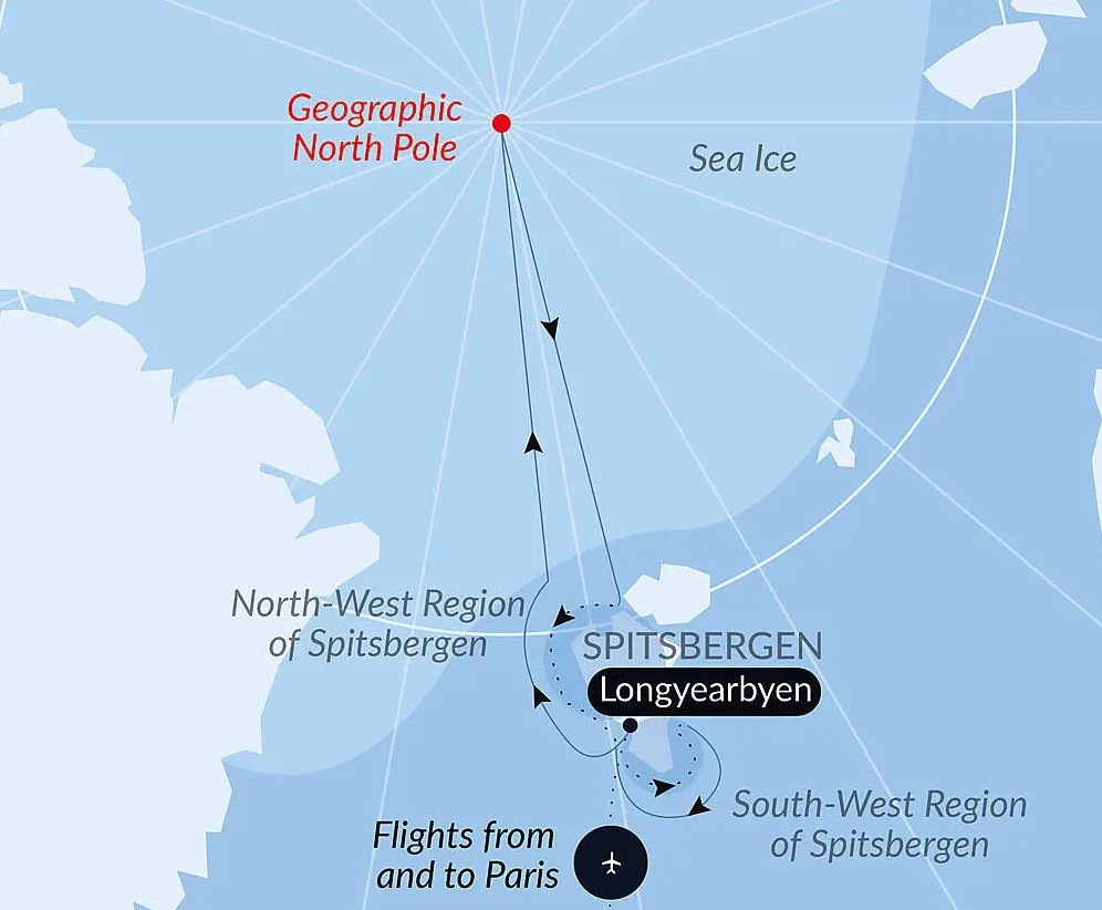 Расширьте границы навигации и отправляйтесь в плавание к 90 градусам северной широты! На борту «Ле Коммандан Шарко», редкого судна, способного справиться с этим вызовом, вы медленно продвинетесь в самое сердце ледяных полей в поисках географического Северного полюса. Из Лонгйира вы направитесь на север, чтобы плыть по водам на краю Земли, к ландшафтам, постоянно меняющимся в зависимости от льда и игры света. На обратном пути восточная Гренландия откроет вам свои величественные фьорды, традиции инуитов и, возможно, северное сияние. Редкая одиссея, между ледяной тишиной и нетронутым величием границ мира.